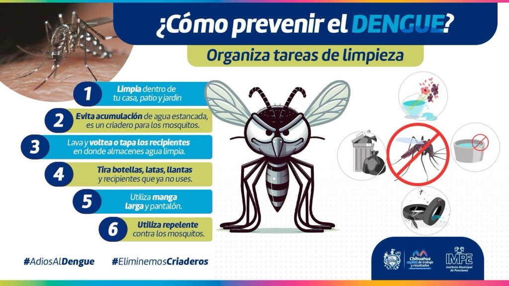 H. Ciudad de Chihuahua, Chih., a 15 de julio de 2025. – Ante el aumento de enfermedades transmitidas por vectores como el dengue, zika y chikungunya, el Gobierno Municipal de Chihuahua, a través del Instituto Municipal de Pensiones (IMPE), emite una serie de recomendaciones clave para evitar contagios, especialmente durante la temporada de lluvias.