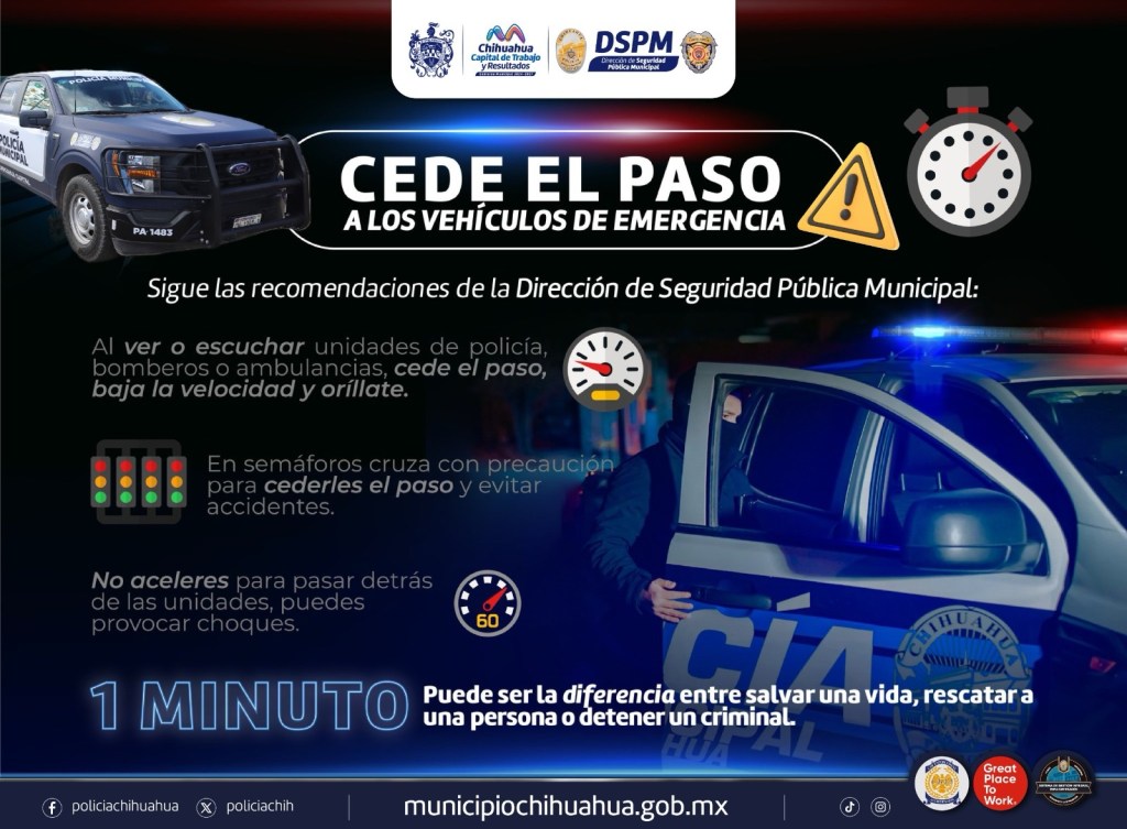🗓️ H. Ciudad de Chihuahua, Chih., a 19 de julio de 2025.– Con el objetivo de mejorar los tiempos de respuesta ante emergencias, la Dirección de Seguridad Pública Municipal (DSPM) hace un llamado a los automovilistas a ceder el paso a vehículos de auxilio, como bomberas, patrullas y ambulancias.