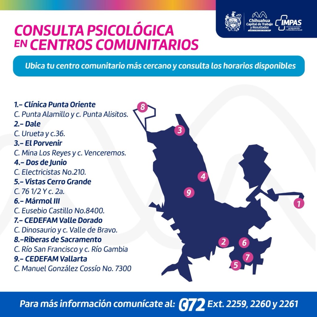 El Gobierno Municipal de Chihuahua, a través del Instituto Municipal de Prevención y Atención a la Salud (IMPAS), invita a la ciudadanía a utilizar el servicio gratuito de consulta psicológica, disponible en diversos centros comunitarios y en la Clínica Punta Oriente.