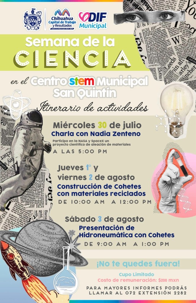 El Gobierno Municipal de Chihuahua, a través del DIF Municipal, invita a niñas, niños y adolescentes de 8 a 17 años a participar en la Semana de la Ciencia, que se llevará a cabo del 30 de julio al 2 de agosto en el Centro STEM San Quintín.