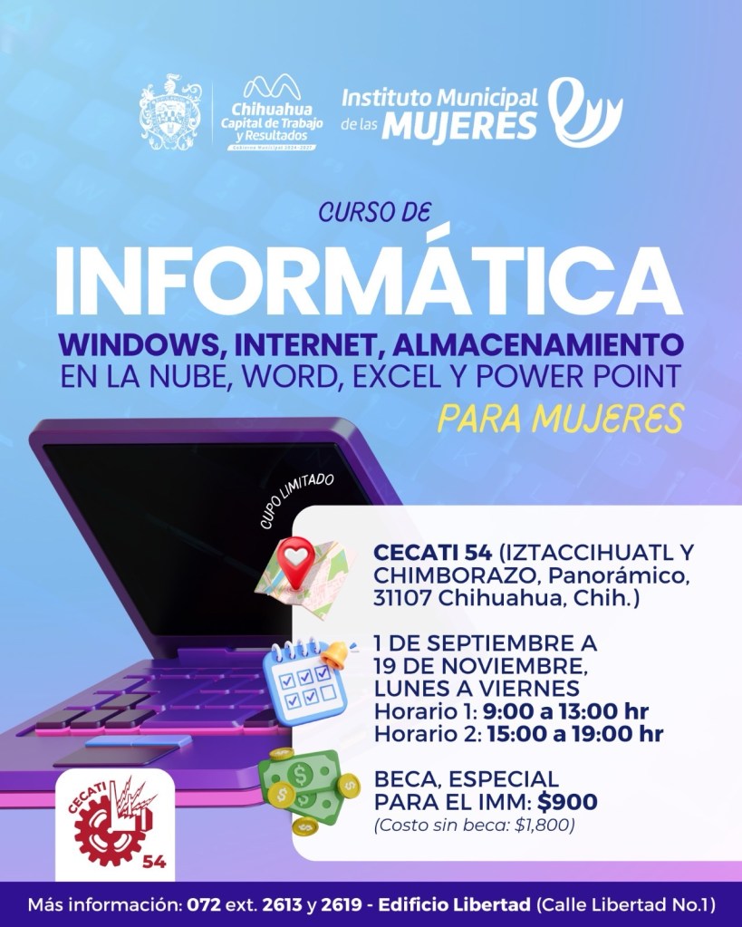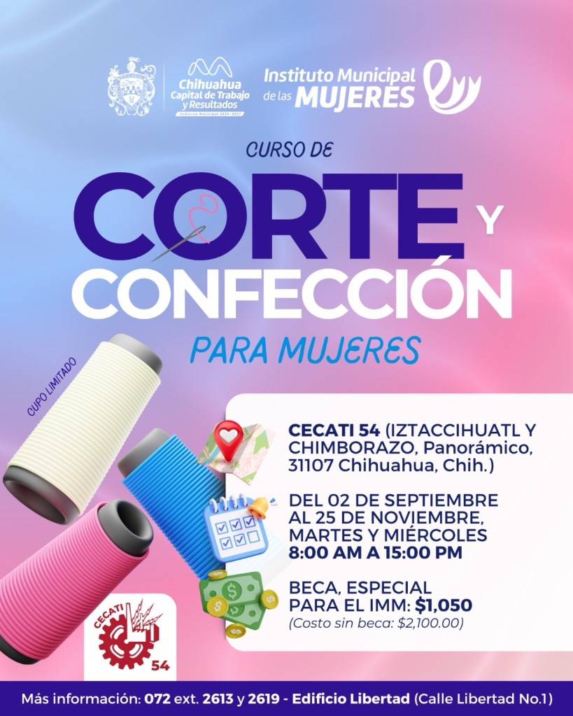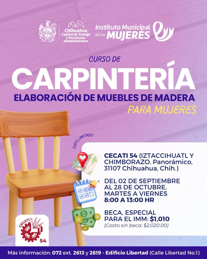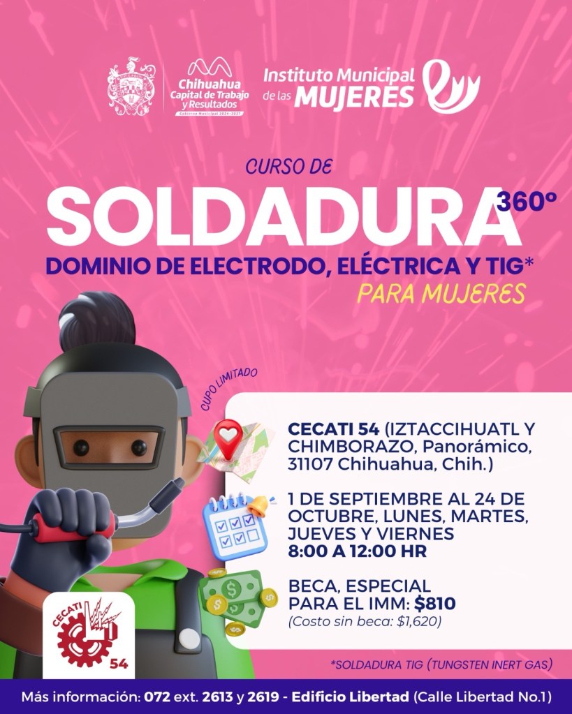 🔹 Soldadura 360°: Electrodo, eléctrica y TIG. 📅 Del 1 de septiembre al 24 de octubre. 🕐 Lunes, martes, jueves y viernes, de 8:00 a 12:00 hrs. 🔹 Carpintería: Elaboración de muebles de madera. 📅 Del 2 de septiembre al 28 de octubre. 🕐 Martes a viernes, de 8:00 a 13:00 hrs. 🔹 Corte y confección: 📅 Del 2 de septiembre al 25 de noviembre. 🕐 Martes y miércoles, de 8:00 a 15:00 hrs. 🔹 Informática: Windows, internet, almacenamiento en la nube, Word, Excel y PowerPoint. 📅 Del 1 de septiembre al 19 de noviembre. 🕐 Lunes a viernes, con dos horarios: 9:00 a 13:00 hrs o 15:00 a 19:00 hrs.