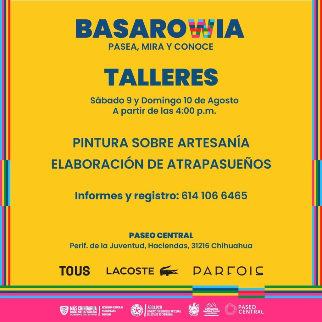 12:00 p.m. – 10:00 p.m.: Exhibición y venta de artesanías 4:00 p.m. y 6:00 p.m.: Talleres simultáneos de pintura, atrapasueños y tallas de madera 🎯