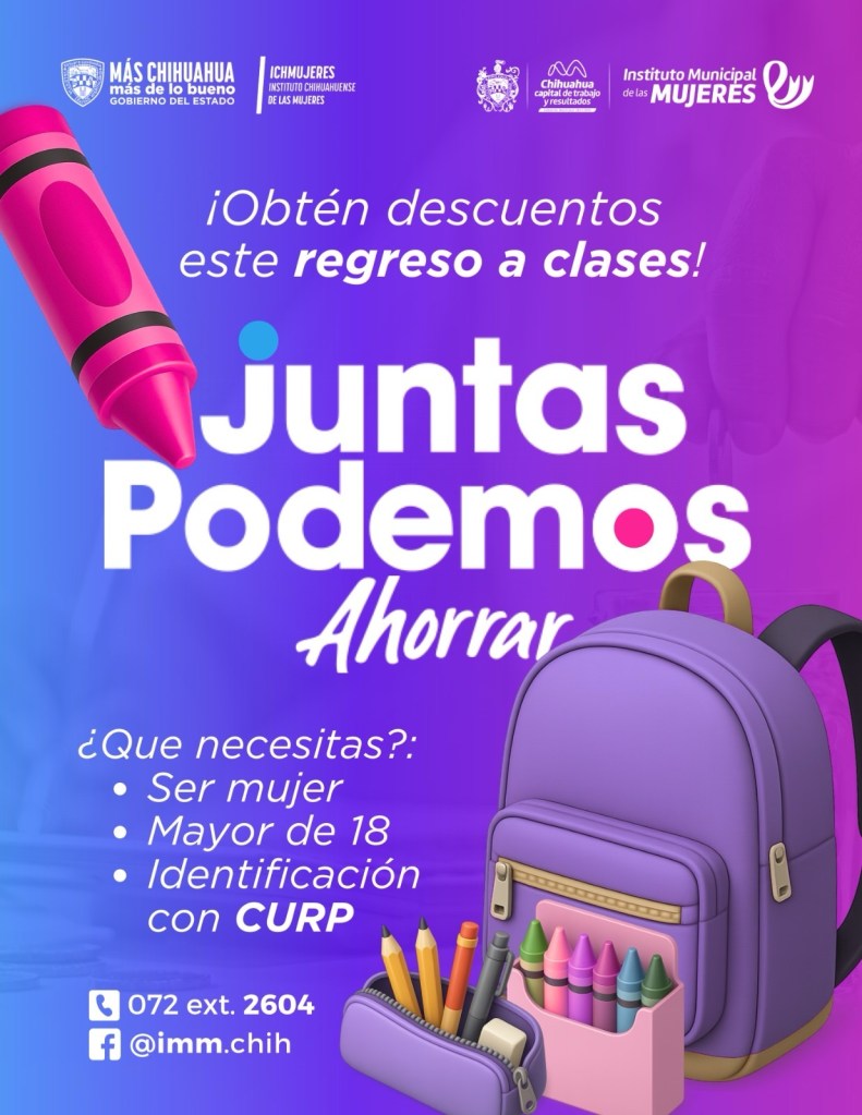 El Gobierno Municipal de Chihuahua, a través del Instituto Municipal de las Mujeres (IMM), invita a todas las mujeres mayores de 18 años a tramitar la tarjeta “Juntas Podemos Ahorrar”, con la que podrán obtener descuentos especiales en útiles escolares, artículos de oficina y productos para el regreso a clases.