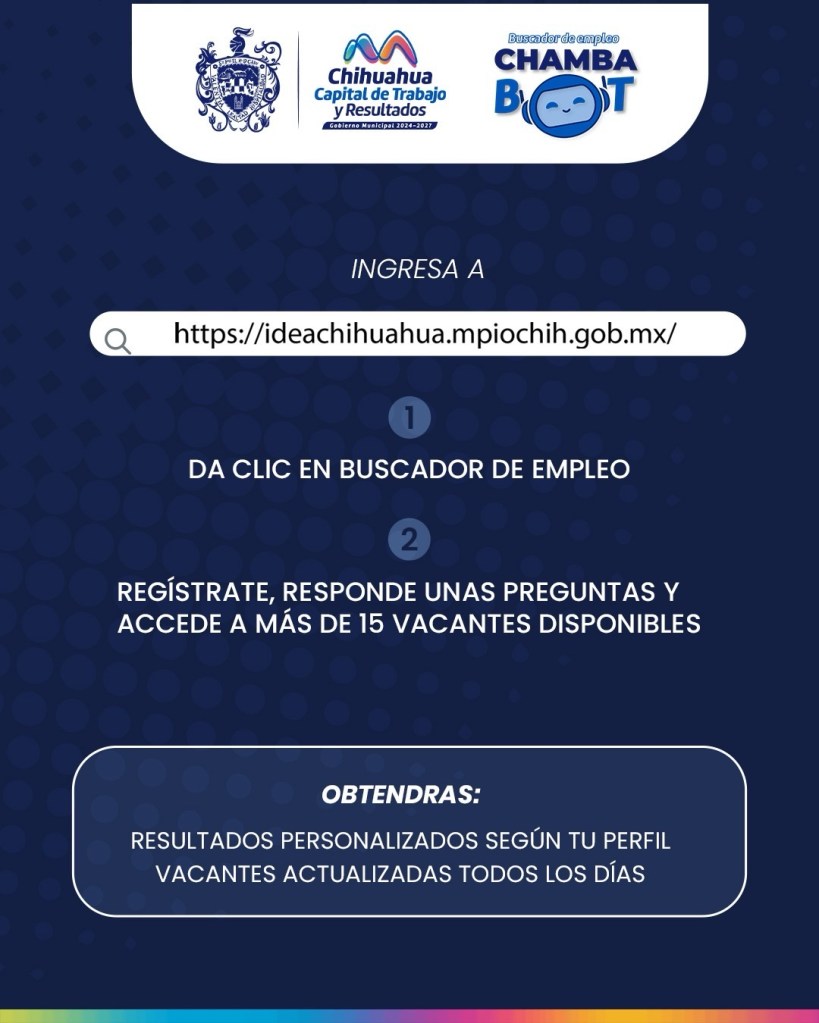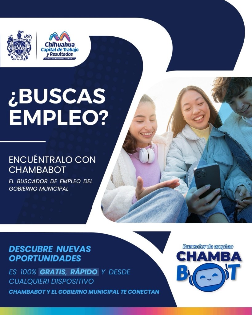 El Gobierno Municipal de Chihuahua, a través de la Dirección de Desarrollo Económico y Competitividad, reitera a la ciudadanía el uso de ChambaBot, la herramienta digital con inteligencia artificial que ayuda a encontrar empleo de forma rápida, sencilla y personalizada.