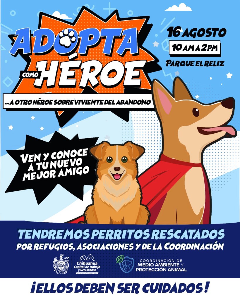 El Gobierno Municipal, a través de la Coordinación de Medio Ambiente y Protección Animal, invita a la jornada “Adopta como Héroe” que se llevará a cabo este sábado 16 de agosto, de 10:00 a 14:00 horas, en el Parque El Reliz 🐶💚.