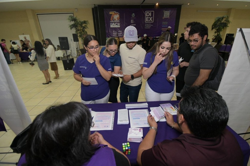 La Universidad Autónoma de Chihuahua (UACH) inauguró la segunda edición de la Feria DIEX en el Salón de Seminarios de la Facultad de Contaduría y Administración, con el objetivo de acercar a estudiantes y pasantes información sobre servicio social, prácticas profesionales y el programa Carnet + Vida Universitaria.