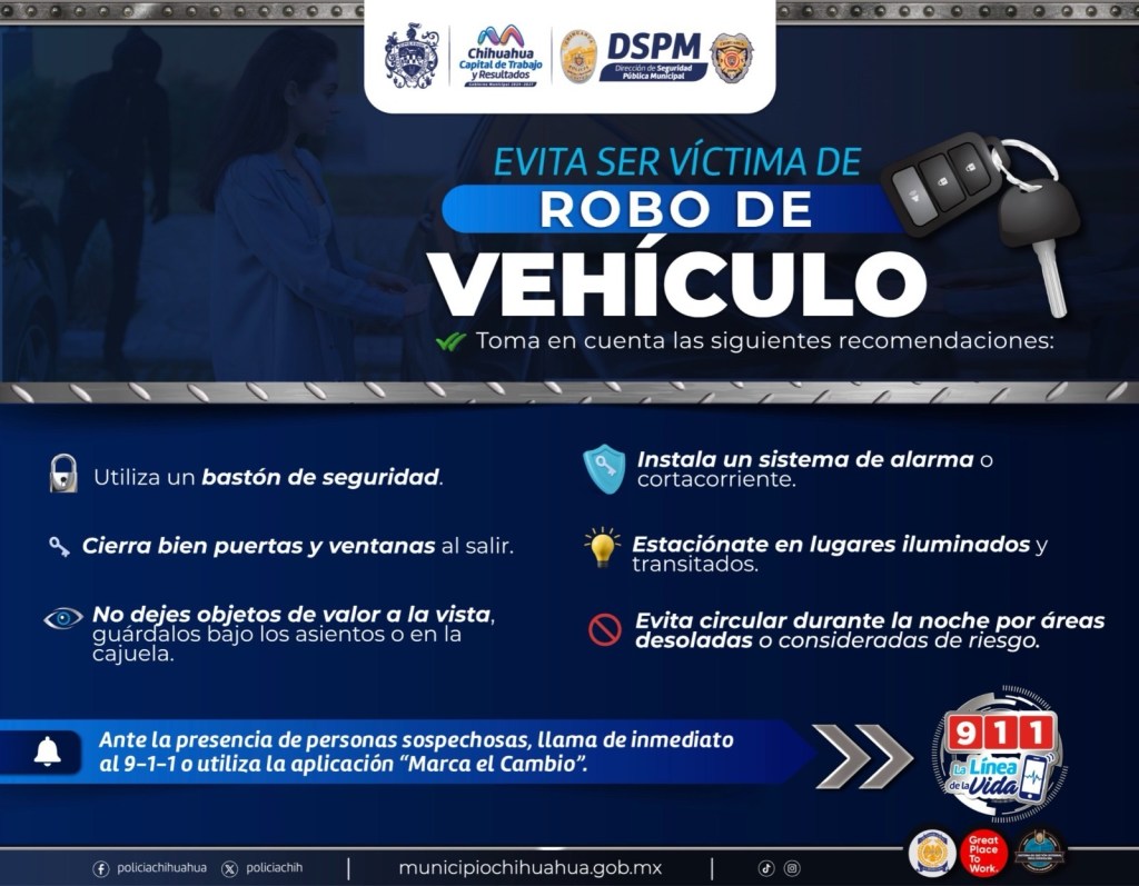 *H. Ciudad de Chihuahua, Chih., a 22 de agosto de 2025.*– Con el objetivo de proteger el patrimonio de las familias chihuahuenses, el Gobierno Municipal, a través de la Dirección de Seguridad Pública Municipal (DSPM), emitió una serie de recomendaciones para evitar robos o daños en vehículos.