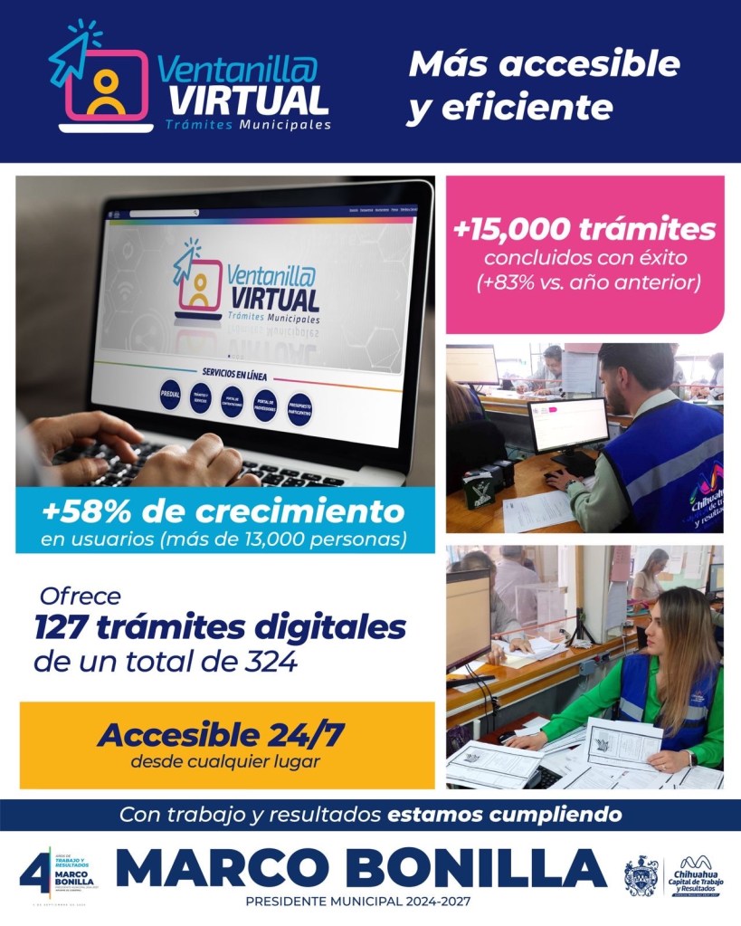 H. Ciudad de Chihuahua, Chih., a 28 de agosto de 2025.– Durante el cuarto año de Gobierno, la Ventanilla Virtual se consolidó como un motor de transformación digital en la administración del alcalde Marco Bonilla.