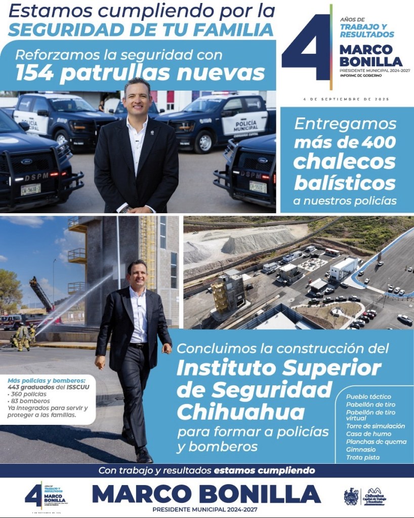 En su Cuarto Informe de Gobierno, el alcalde Marco Bonilla destacó que Chihuahua Capital consolidó una estrategia integral de seguridad que combina tecnología de punta, equipamiento de primer nivel y proximidad ciudadana, con resultados tangibles para las familias chihuahuenses.