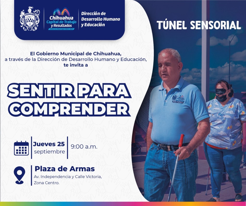 H. Ciudad de Chihuahua, Chih., a 23 de septiembre de 2025.- El Gobierno Municipal, a través del Departamento de Grupos Vulnerables de la Dirección de Desarrollo Humano y Educación, invita a la ciudadanía a participar en el túnel sensorial “Sentir para comprender”, este jueves 25 de septiembre en la Plaza de Armas, una experiencia inmersiva que permitirá a los asistentes descubrir cómo es vivir sin la vista.