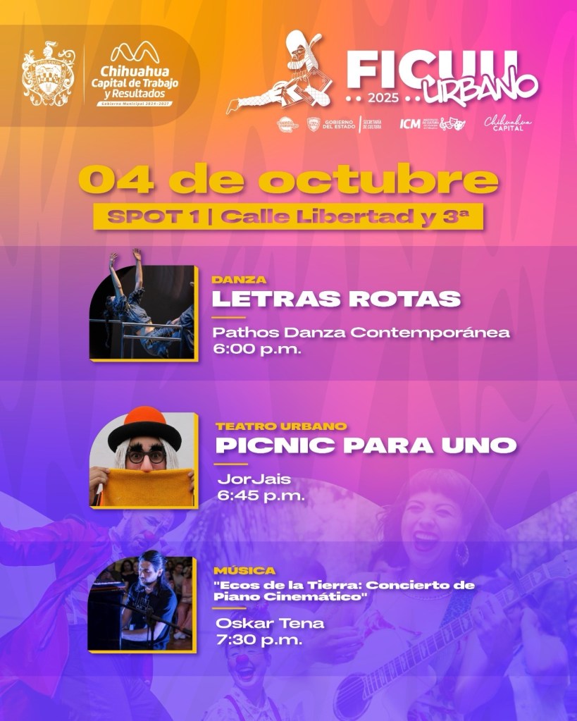 Pathos Danza Contemporánea – “Letras Rotas” 🩰 JorJais – “Picnic para uno” 🎭 Oskar Tena – Concierto de piano cinemático 🎹 Coyote Deluxe – Hard Rock original orgullosamente chihuahuense 🎸 Ariel Solís Quintet – Jazz de alto nivel 🎷