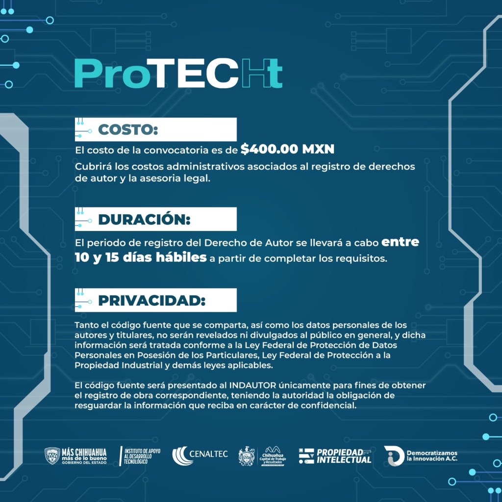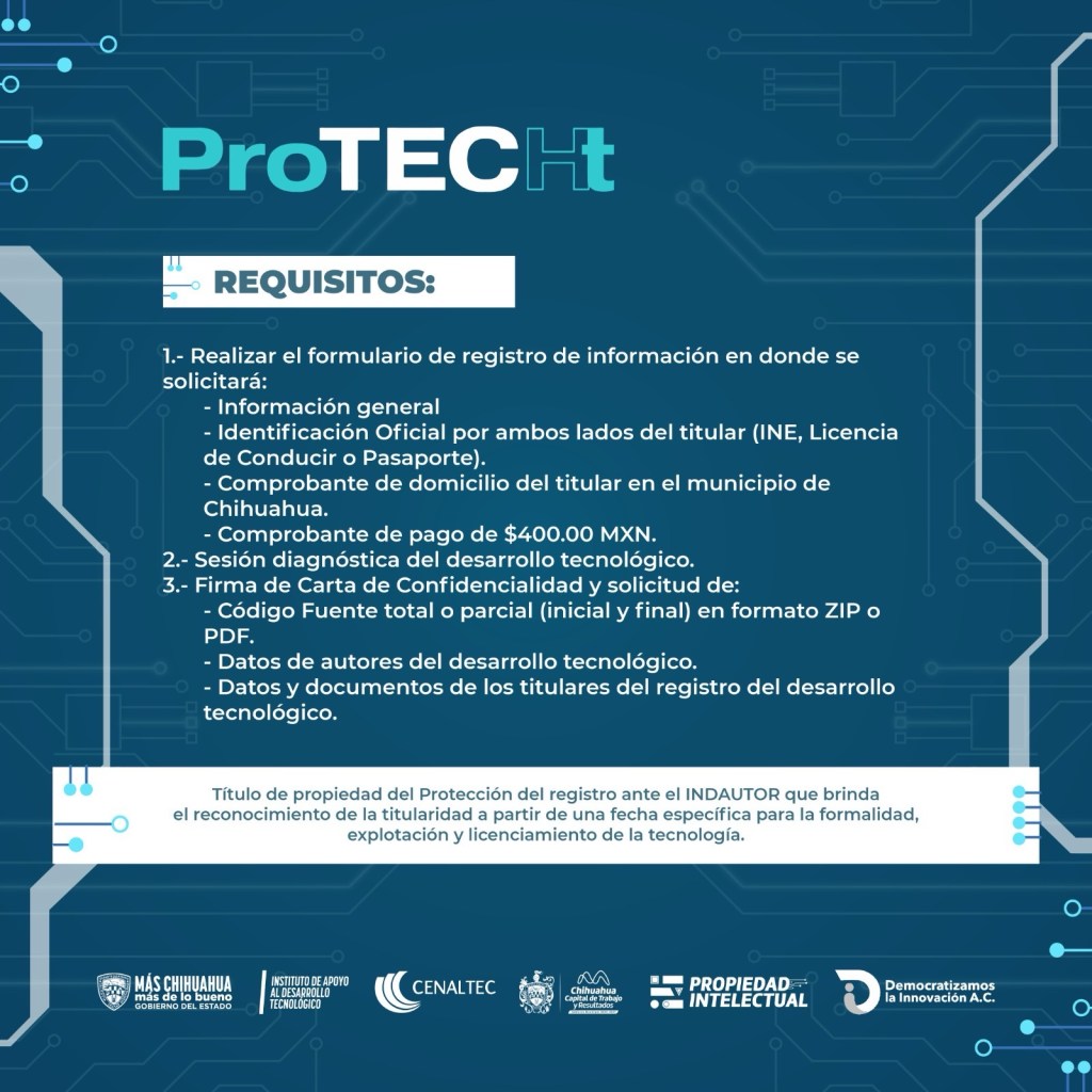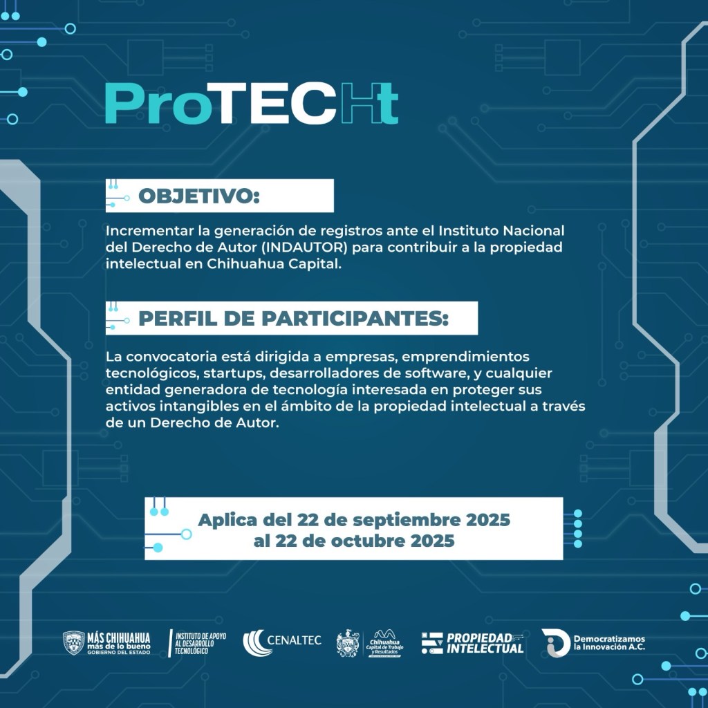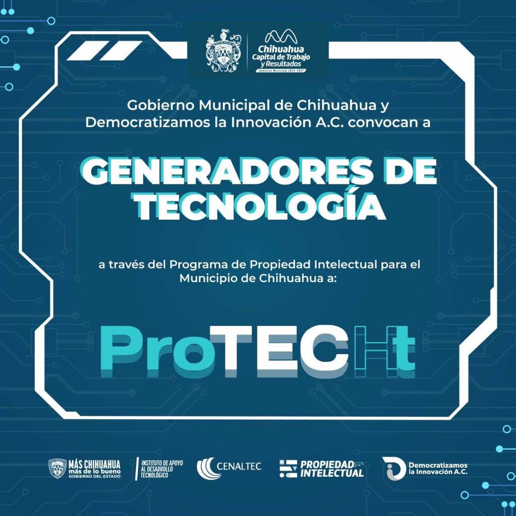 El Gobierno Municipal de Chihuahua, a través de la Dirección de Desarrollo Económico y Competitividad, en colaboración con Democratizamos la Innovación A.C., lanzó la convocatoria del programa ProTECHt, una iniciativa para que empresas, startups, desarrolladores de software y generadores de tecnología registren y protejan sus creaciones.