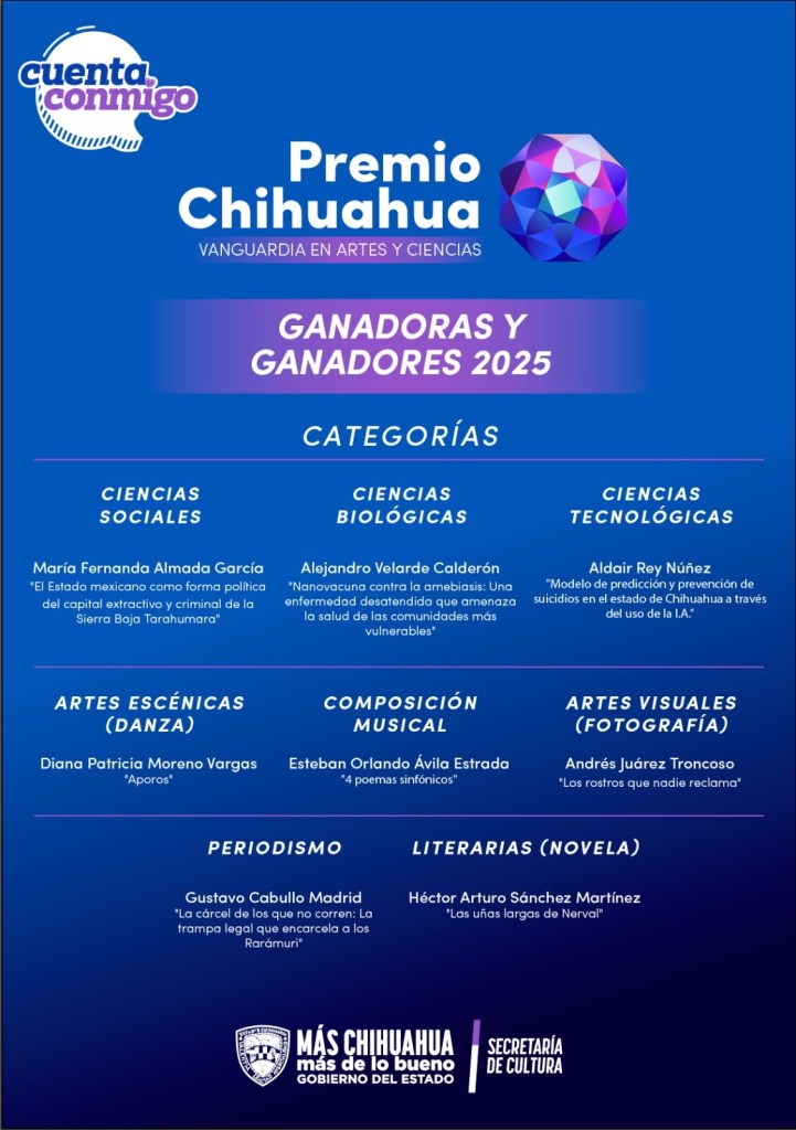 📖 Literatura: Héctor Arturo Sánchez Martínez – “Las uñas largas de Nerval” 🎶 Composición Musical: Esteban Orlando Ávila Estrada – “4 poemas sinfónicos” 📷 Artes Visuales/Fotografía: Andrés Juárez Troncoso – “Los rostros que nadie reclama” 💃 Artes Escénicas/Danza: Diana Patricia Moreno Vargas – “Aporos” 📰 Periodismo: Gustavo Cabullo Madrid – “La cárcel de los que no corren: La trampa legal que encarcela a los Rarámuri” 🌎 Ciencias Sociales: María Fernanda Almada García – “El Estado mexicano como forma política del capital extractivo y criminal de la Sierra Baja Tarahumara” 🧬 Ciencias Biológicas: Alejandro Velarde Calderón – “Nanovacuna contra la amebiasis: una enfermedad desatendida que amenaza la salud de las comunidades más vulnerables” 🤖 Ciencias Tecnológicas: Aldair Rey Núñez – “Modelo de predicción y prevención de suicidios en el estado de Chihuahua a través del uso de la IA”