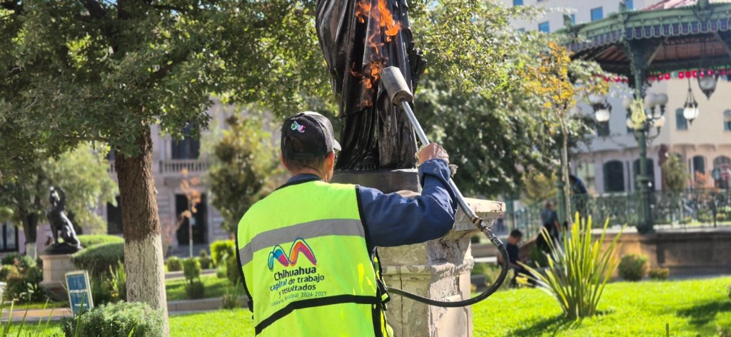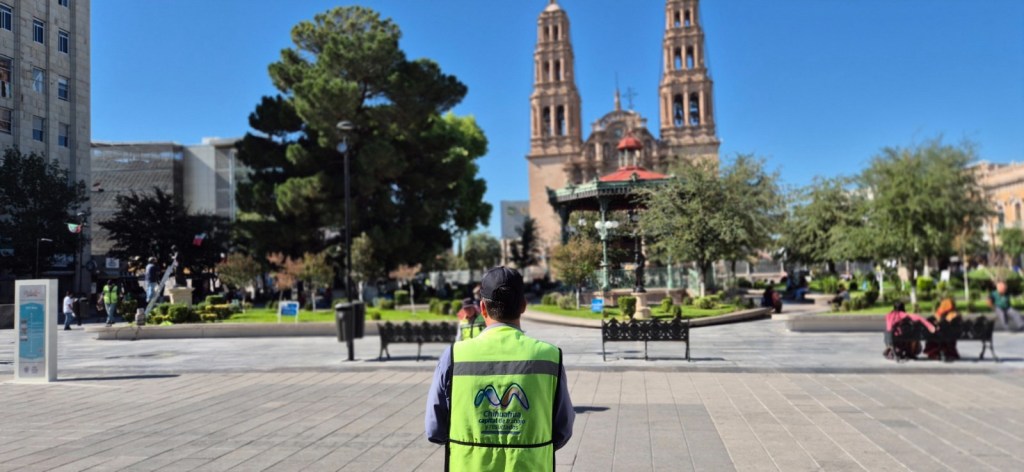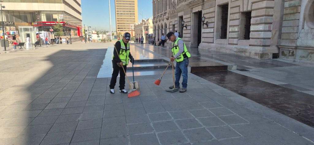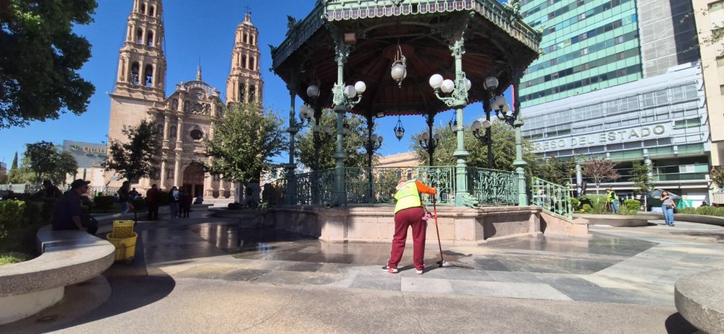 H. Ciudad de Chihuahua, Chih., a 3 de octubre de 2025.- Plaza de Armas, el corazón del Centro Histórico de la ciudad y punto de encuentro para miles de familias, luce impecable gracias a las labores diarias de limpieza que realiza la Dirección de Mantenimiento Urbano del Gobierno Municipal.