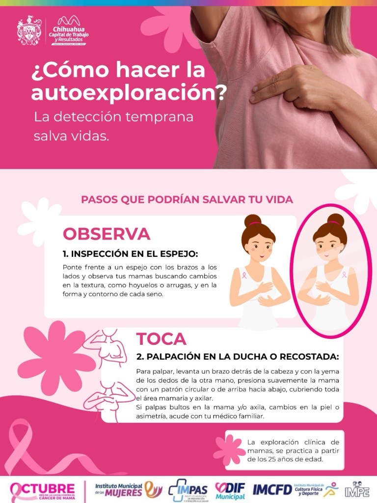*H. Ciudad de Chihuahua, Chih., a 6 de octubre de 2025*.- En el marco del Mes de Sensibilización sobre el Cáncer de Mama, el Gobierno Municipal de Chihuahua, a través del Instituto Municipal de Pensiones (IMPE), invita a las mujeres a realizar la autoexploración mamaria mensual, herramienta clave para familiarizarse con su cuerpo y detectar cualquier cambio a tiempo.
