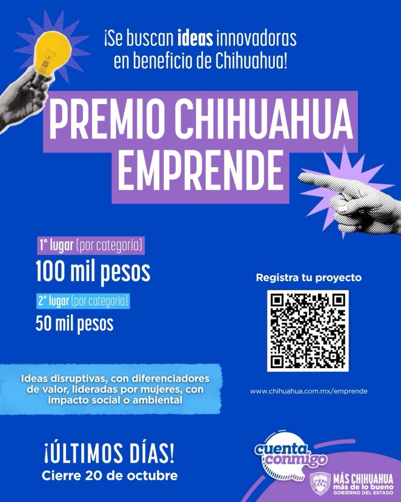 El Gobierno del Estado de Chihuahua, a través de la Secretaría de Innovación y Desarrollo Económico (SIDE), invita a las y los emprendedores chihuahuenses a registrarse en la convocatoria del Premio Chihuahua Emprende 2025, la cual permanecerá abierta hasta el próximo 20 de octubre.