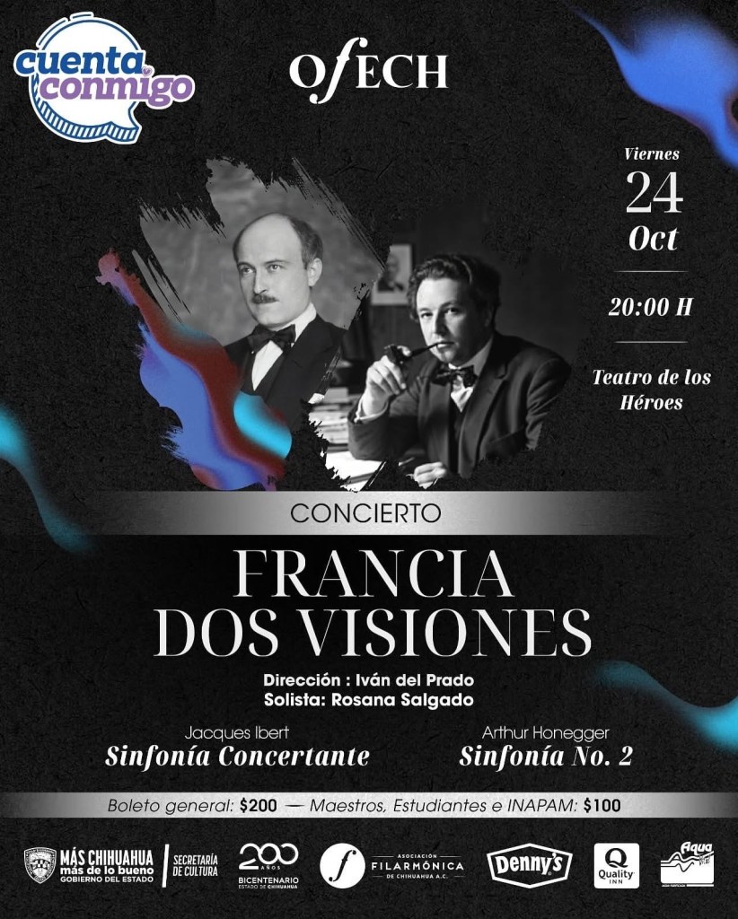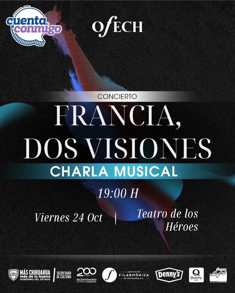 La Secretaría de Cultura del Estado invita a la ciudadanía a disfrutar de un viaje musical a cargo de la Orquesta Filarmónica del Estado de Chihuahua (Ofech), con el concierto “Francia, Dos Visiones”, que se llevará a cabo este viernes 24 de octubre, en el Teatro de los Héroes de la capital.