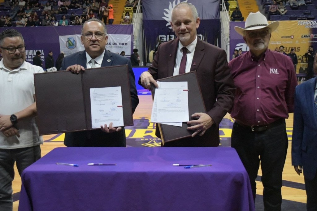 Durante el encuentro deportivo binacional de básquetbol entre los Dorados de la Universidad Autónoma de Chihuahua (UACH) y los Aggies de la New Mexico State University (NMSU), se llevó a cabo la firma de un convenio de colaboración académica que permitirá ofrecer programas de doble titulación en áreas del sector agropecuario.