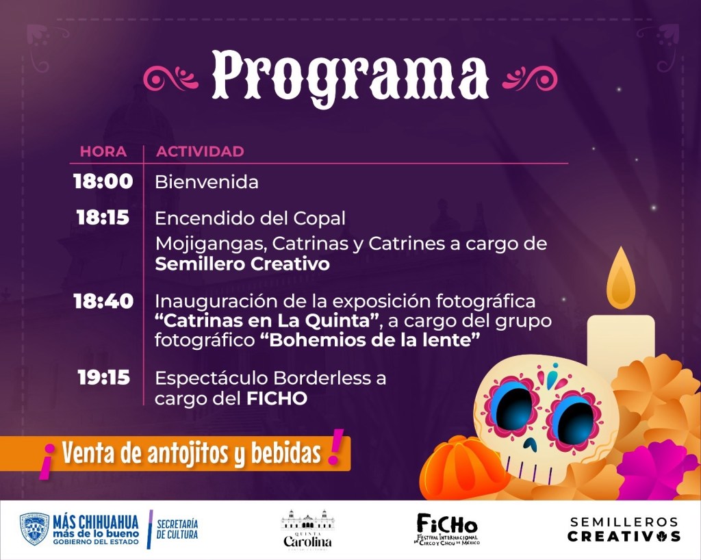 📸 A las 18:40 horas se inaugurará la exposición fotográfica “Catrinas en La Quinta”, del grupo Bohemios de la Lente, y como cierre del evento se presentará el espectáculo “Borderless”, a cargo del Festival Internacional de Circo y Chou de México (FICHO).
