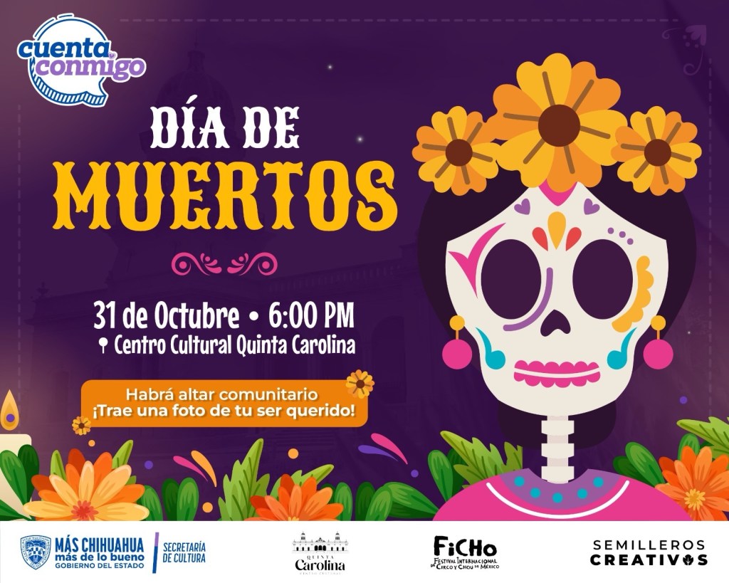 La Secretaría de Cultura del Estado de Chihuahua invita a la ciudadanía al tradicional festival de Día de Muertos que se realizará en el Centro Cultural Quinta Carolina, en colaboración con el colectivo Semilleros Creativos y el Festival Internacional de Circo y Chou de México (FICHO).