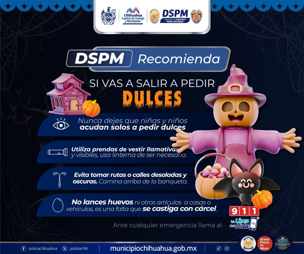 H. Ciudad de Chihuahua, Chih., a 30 de octubre de 2025.– La Dirección de Seguridad Pública Municipal (DSPM) reforzará los rondines de vigilancia este 31 de octubre, con motivo de las celebraciones de Halloween, a fin de garantizar la seguridad de las niñas y los niños que salgan a pedir dulces por las calles de la capital. 👻🚔🍬