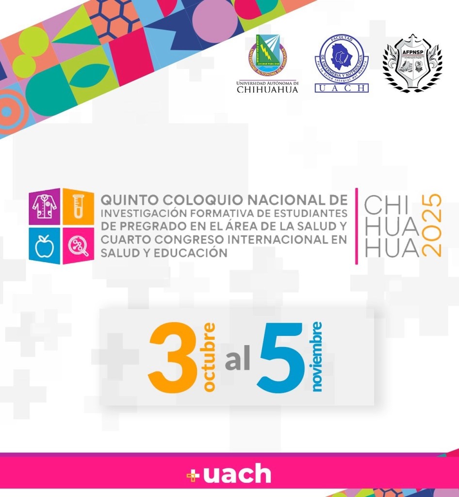 Chihuahua, Chih., a 30 de octubre de 2025.– La Facultad de Enfermería y Nutriología (FEN-UACH) anunció la realización del 5.º Coloquio Nacional de Investigación Formativa de Estudiantes de Pregrado en el Área de la Salud y el 4.º Congreso Internacional en Salud y Educación, que se llevarán a cabo del 3 al 5 de noviembre de 2025 en la ciudad de Chihuahua. 🧬📚