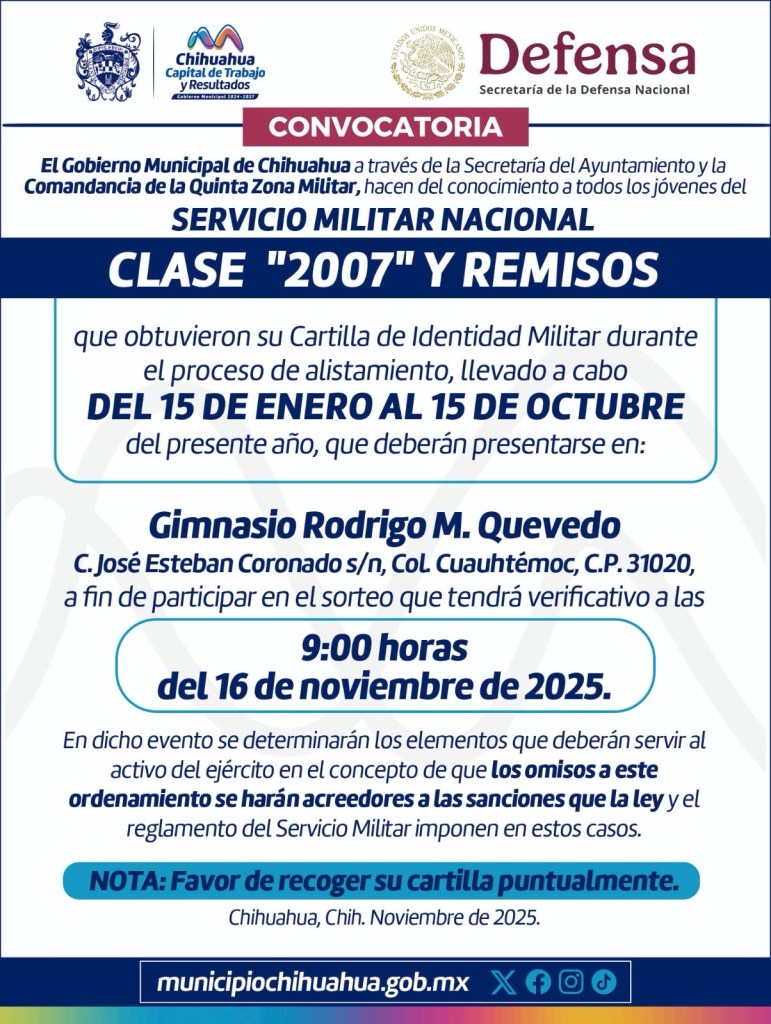 H. Ciudad de Chihuahua, Chih., a 5 de noviembre de 2025.– El Gobierno Municipal de Chihuahua, a través de la Junta Municipal de Reclutamiento (Secretaría del Ayuntamiento), informa que el sorteo del Servicio Militar Nacional (SMN) para la clase 2007 y remisos se llevará a cabo el domingo 16 de noviembre en el Gimnasio Rodrigo M. Quevedo.