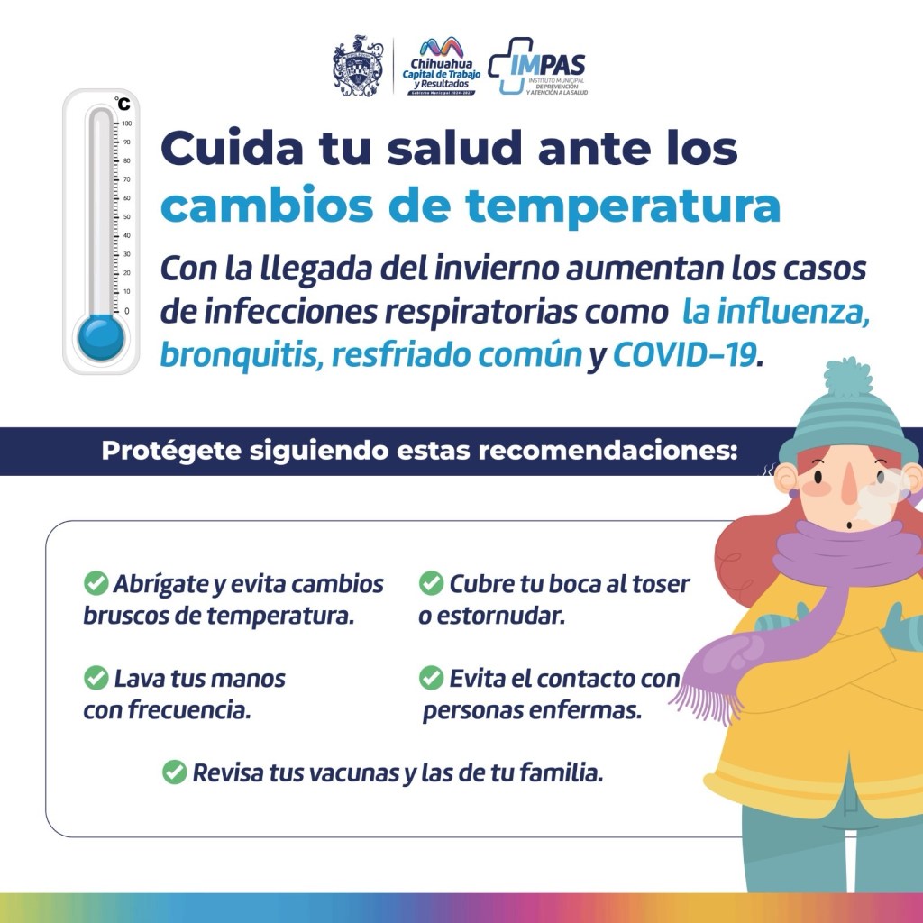 H. Ciudad de Chihuahua, Chih., a 6 de noviembre de 2025.– El Gobierno Municipal de Chihuahua, a través del Instituto Municipal de Prevención y Atención a la Salud (IMPAS), exhorta a la ciudadanía a reforzar las medidas preventivas ante el incremento de infecciones respiratorias agudas que afectan la nariz, la garganta y los pulmones durante la temporada invernal. 🌬️❄️