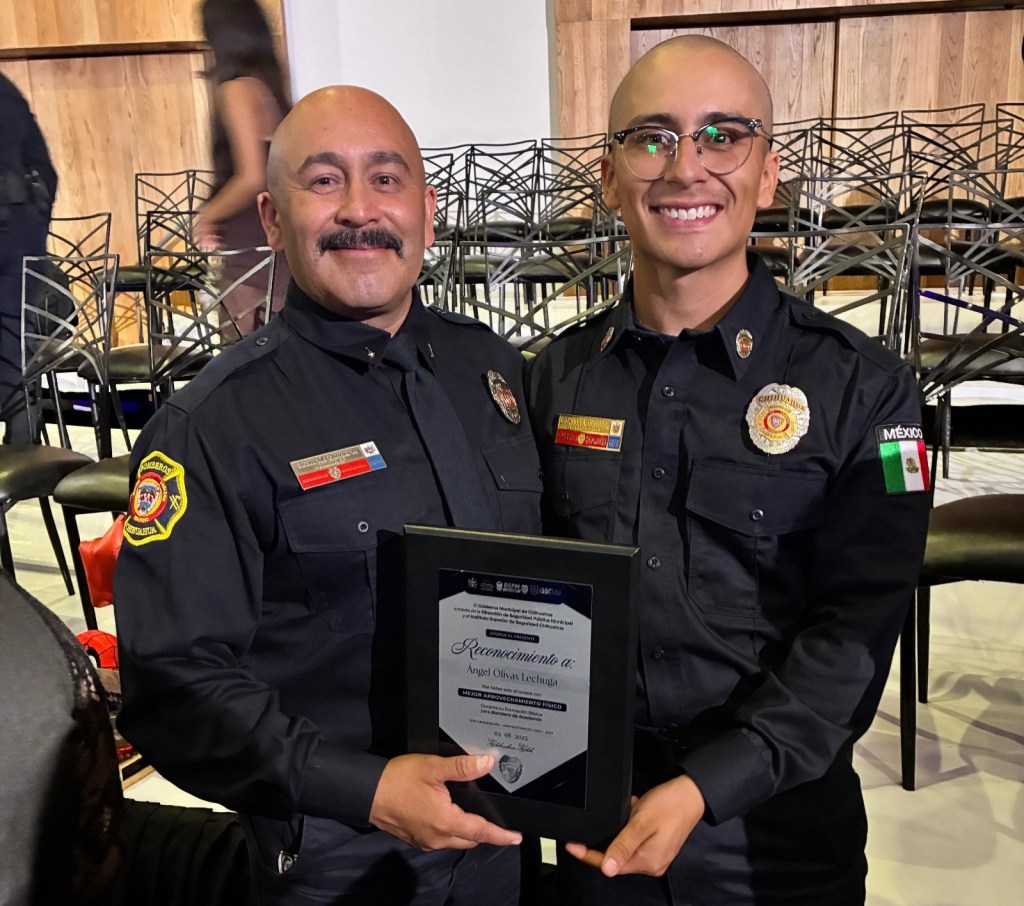 Pero su mayor orgullo es ver a su hijo Ángel Olivas, recién egresado de la academia del ISSCUU, unirse también a las filas del H. Cuerpo de Bomberos: