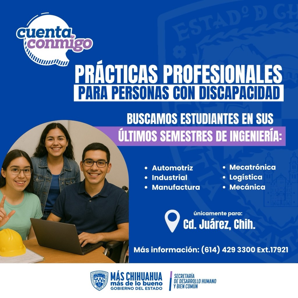 Chihuahua, Chih., a 12 de noviembre de 2025.– Con el objetivo de fortalecer la inclusión laboral y el desarrollo profesional de los sectores más vulnerables, el Gobierno del Estado, a través de la Secretaría de Desarrollo Humano y Bien Común (SDHyBC), gestionó nuevas vacantes y oportunidades de prácticas profesionales para personas con discapacidad, adultos mayores y estudiantes próximos a egresar. 🤝🌟