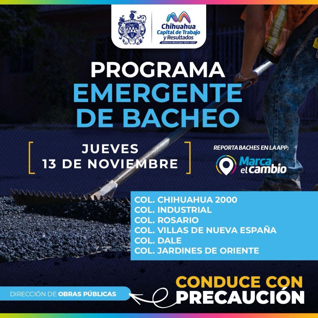 H. Ciudad de Chihuahua, Chih., a 13 de noviembre del 2025.– El Gobierno Municipal, a través de la Dirección de Obras Públicas, realizará este jueves 13 de noviembre trabajos de bacheo emergente en calles de las colonias Chihuahua 2000, Industrial, Rosario, Villas de Nueva España, Dale y Jardines de Oriente.
