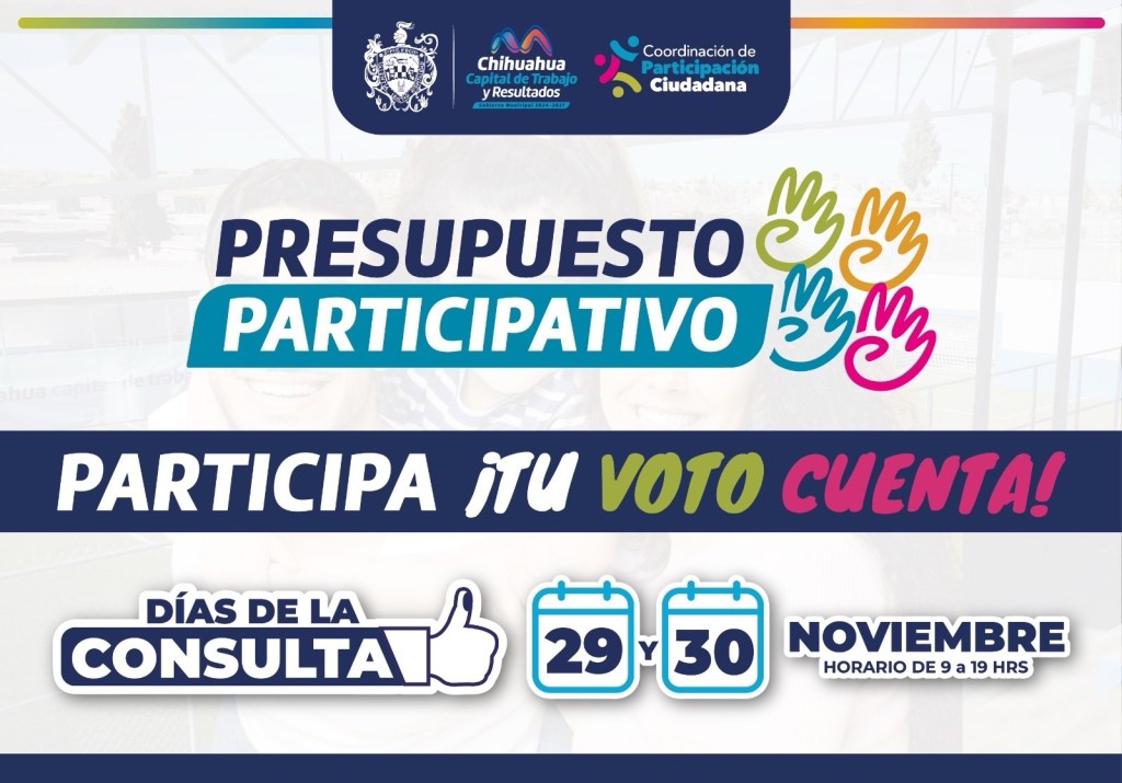 La consulta se realizará los días 29 y 30 de noviembre, fecha en la que las y los chihuahuenses podrán decidir qué proyectos y obras se financiarán en distintas colonias de la ciudad para el año 2026, fortaleciendo así la participación ciudadana y el uso responsable de los recursos públicos.