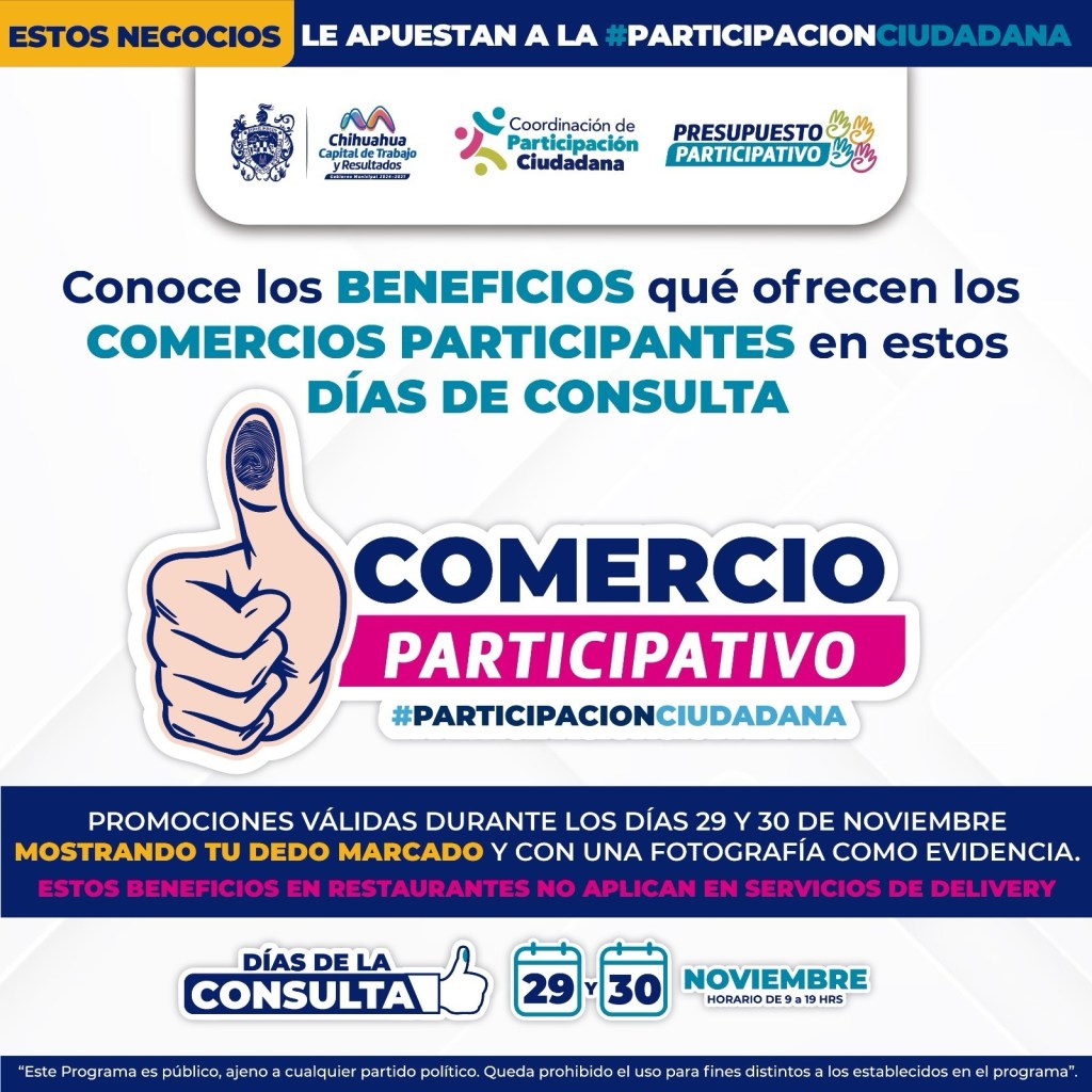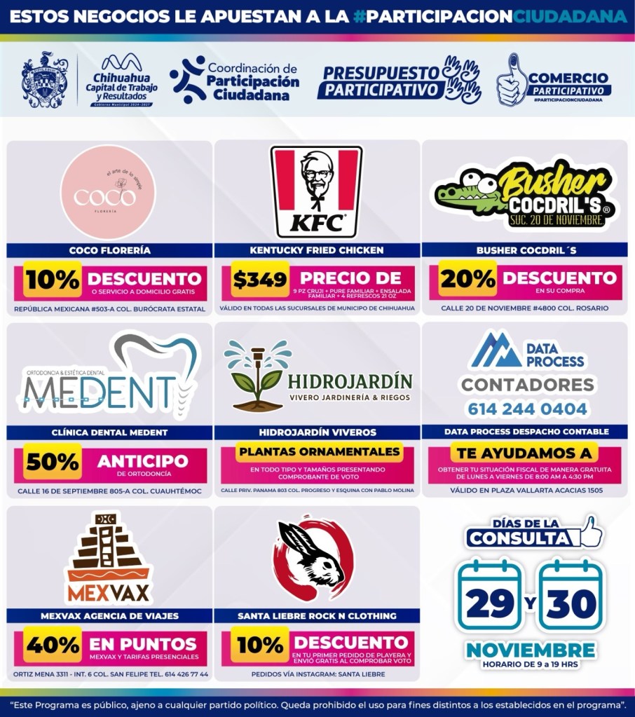*H. Ciudad de Chihuahua, Chih., 29 de noviembre de 2025.*– El Gobierno Municipal informó que 26 comercios locales se sumaron a la consulta del Presupuesto Participativo 2026 para ofrecer descuentos, promociones y beneficios especiales a quienes participen en la jornada de votación este 29 y 30 de noviembre, ya sea en urnas físicas o mediante la aplicación móvil oficial. 🗳️📲
