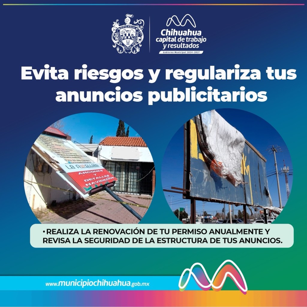 El Gobierno Municipal de Chihuahua, a través de la Dirección de Desarrollo Urbano y Ecología, exhorta a las y los propietarios de anuncios publicitarios y estructuras a realizar la renovación anual de sus permisos, como parte del mantenimiento preventivo que permite garantizar la seguridad de la ciudadanía.