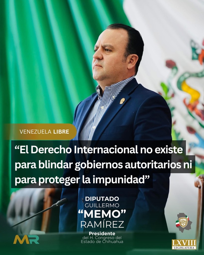 Chihuahua, Chih., a 5 de enero de 2026.– El diputado Guillermo Ramírez, presidente del H. Congreso del Estado, emitió una postura clara y firme desde la perspectiva del derecho internacional respecto a la situación que enfrenta Nicolás Maduro, al señalar que dicho marco jurídico no protege la impunidad ni a regímenes autoritarios.