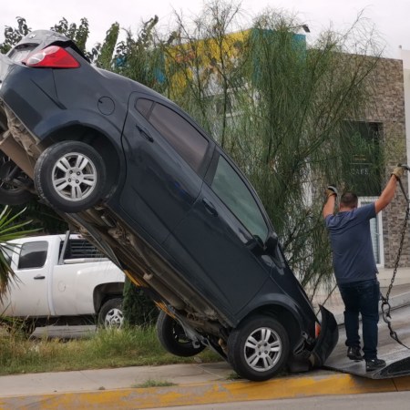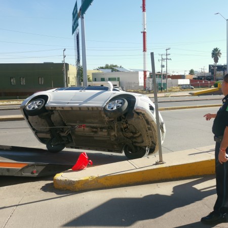 Extraño accidente en Quintas Carolinas; vehículo queda colgando de poste